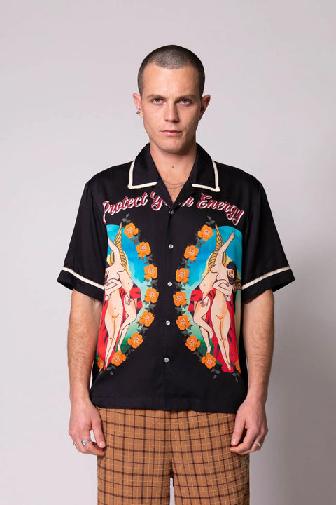 Our best-selling Resort Shirt is back in a bold new edition, created in collaboration with Melbourne artist Yakob Morley. Showcasing his signature Guardian Angel artwork printed on soft, breathable 100% Lyocell in classic black. Featuring contrast trim detail on the collar and sleeve hems and peal/silver snap buttons.